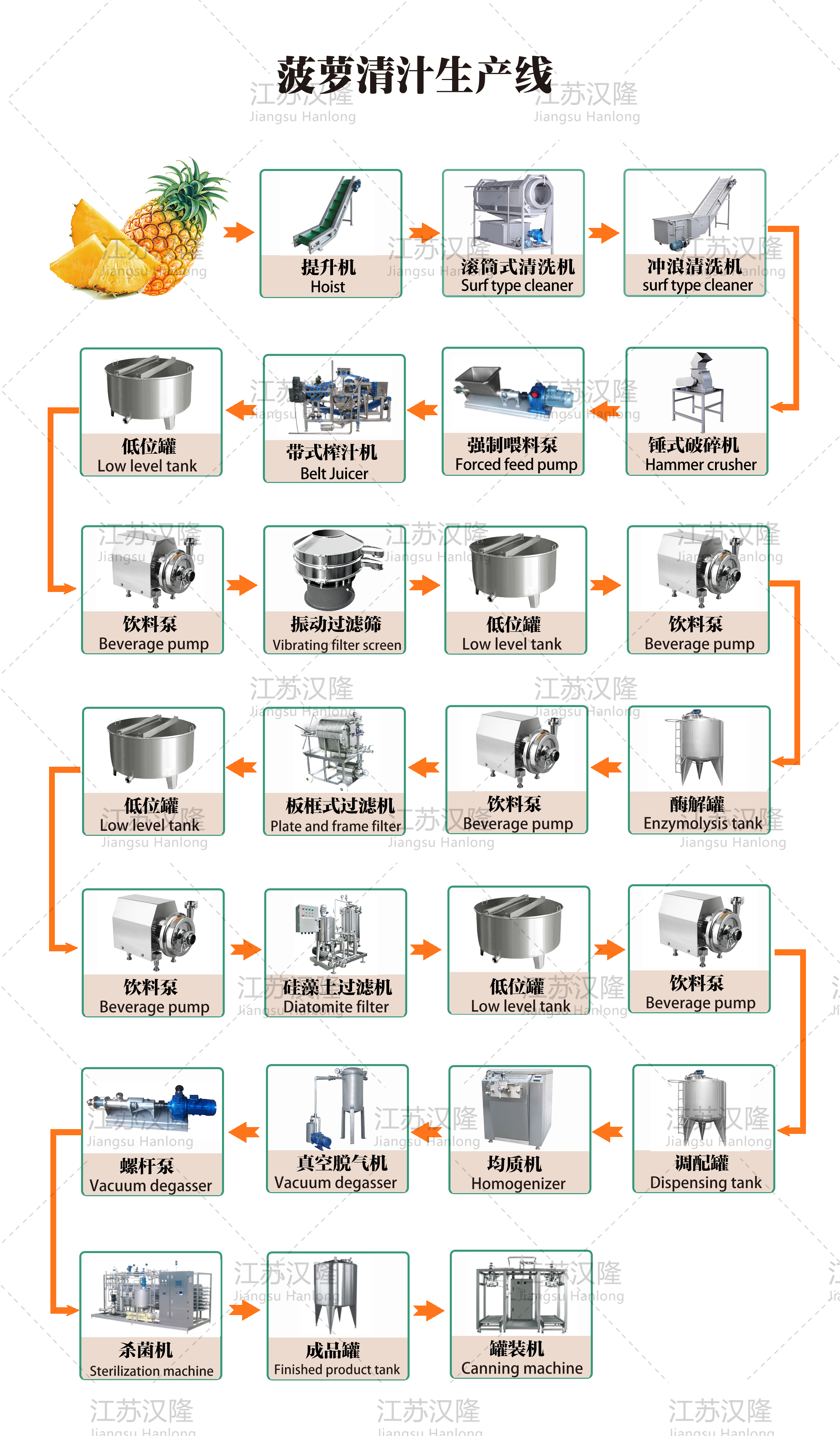 4.榨汁:把去皮的菠蘿切成塊,送入螺旋榨汁機榨汁,把第一次榨汁后的果渣,加少量清水攪拌均勻后,再重榨一次,以提高出汁率。過濾壓榨出來的新鮮果汁中含有大量的粗纖維和其它雜質,先經(jīng)粗濾后精濾。精濾設備用濾孔大小約為:0.5mm的刮板過濾機,目的是濾出粗纖維和其它雜質。精濾設備網(wǎng)為120目的離心過濾機,不僅要除去全部懸浮物,而且還要除去易產(chǎn)生沉淀的膠粒。