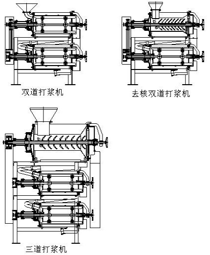 該機(jī)有單道和雙道兩種機(jī)型,當(dāng)用于核果類水果(如芒果)打漿時(shí),若選用單道去核打漿機(jī),皮肉從出料斗流入緩沖罐中,核從出渣處排出。去核雙道打漿機(jī),頭道去核,二道打漿實(shí)現(xiàn)全自動(dòng)將果核、果皮和渣分離。推薦用戶優(yōu)先選用去核雙道打漿機(jī)。打漿原理參照DJ型打漿機(jī)。