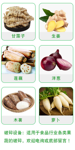 該機是對大而長的根類進行破碎,為了能進一步細破碎而設計的一款破碎機。具有結(jié)構(gòu)新穎緊湊、節(jié)能高效、生產(chǎn)效率高等特點。該機廣泛用于對葛根、山藥根類果蔬的破碎。