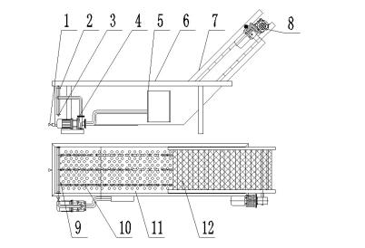 1、排污閥 2、沖洗總管 3、水泡總管 4、循環(huán)水泵 5、水過(guò)濾箱 6、水箱 7、提升機(jī)架 8、調(diào)速減速機(jī) 9、沖洗噴嘴 10、水泡支管 11、防沉網(wǎng) 12、提升網(wǎng)帶