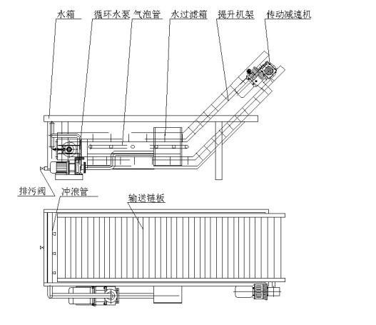 該機由水箱、提升機、循環(huán)沖洗水泵、傳動部分等部件組成,工作時物料直接被倒在輸送鏈板上,在水箱中輸送;而又由于輸送鏈板底部設(shè)有氣泡管,使物料產(chǎn)生翻滾,從而清洗物料。水箱內(nèi)的水經(jīng)過水過濾箱過濾后,由循環(huán)水泵通向沖浪管和氣泡管。本機也可根據(jù)用戶要求在提升段和水箱上部加設(shè)噴淋管。