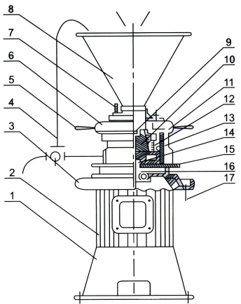 1、底座 2、電機 3、端蓋 4、循環(huán)管 5、手柄 6、調(diào)節(jié)盤 7、冷卻水接頭 8、加料門 9、旋葉刀 10、動磨盤 11、靜磨盤 12、靜磨盤座 13、O型圈 14、機械密封 15、殼體 16、組合密封 17、排漏管接頭
