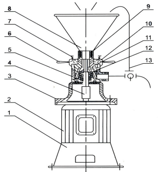 1、底座 2、電機 3、殼體 4、連軸器 5、機械密封 6、手柄 7、鎖緊螺絲 8、加料門 9、進(jìn)料管道 10、調(diào)節(jié)盤 11、靜磨盤12、動磨盤 13、循環(huán)管