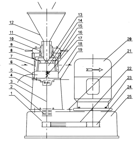 1、從動帶輪 2、軸承 3、主軸 4、機座 5、軸承 6、出料口 7、冷卻水接頭 8、進(jìn)料蓋板 9、手柄 10、軸承 11、限位螺母 12、加料門 13、旋葉刀 14、動磨盤 15、靜磨盤 16、調(diào)節(jié)盤 17、機械密封 18、殼體 19、排泄孔 20、電機 21、調(diào)節(jié)螺釘 22、三角皮 23、電機座 24、主動帶輪 25、底座