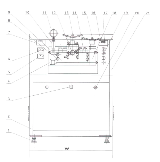 1.底腳 2.出水口 3.拉派 4.進(jìn)料口 5.電流表 6.電壓表 7.銘牌 8.泵體螺母 9.泵體 10.傳壓缸 11.壓力表 12.高壓手槍 13.低壓手槍 14.壓蓋 15.溢流閥手槍 16.上蓋 17.標(biāo)牌 18. 溢流閥體 19.電源開關(guān) 20.電器箱門鎖 21.外罩