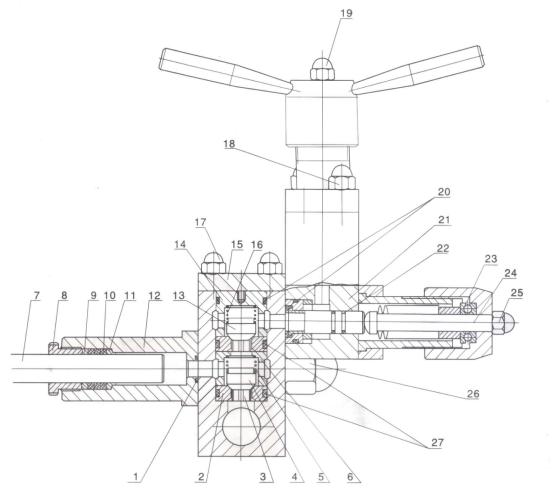 1.O型圈、密封墊圈 2.下閥座 3.導(dǎo)向桿 4.下閥門 5.下閥門彈簧 6.下花蘭 7.柱塞 8.緊定螺釘 9.壓環(huán) 10. 柱塞密封圈 (V型或方型 、隔離片) 11.定位套、墊環(huán) 12. 柱塞密封套 13.上閥門 14.上蘭花 15.壓板 16.上閥門彈簧 17.螺栓、螺母 18. 螺栓、螺母 19.加壓桿螺母 20.O型圈、密封圈 21.一ji均質(zhì)閥體 22.均質(zhì)桿、O型圈 23.平面軸承 24.加壓桿 25.加壓桿螺母 26.泵體螺母 27.上、下閥門密封圈