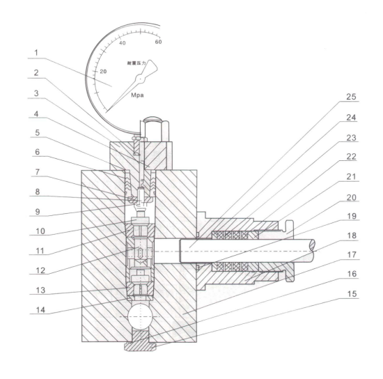 1.壓力表組件 2.表座密封墊 3.表座壓蓋 4.壓蓋 5.圓錐柱 6.壓蓋密封墊 7.緊鎖螺帽 8.調(diào)節(jié)螺帽 9.帶孔緊鎖螺帽 10.錐閥芯 11.上錐閥座 12.限位套 13. 下錐閥座 14.調(diào)整墊片 15.螺塞 16.O型橡膠密封圈 17.泵體 18.柱塞密封套 19.泵體平面密封圈 20.緊定螺釘 21.壓環(huán) 22.柱塞密封圈 (V型或方型) 23.隔離片 24.座環(huán) 25.柱塞
