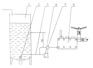 1.料桶 2.濾網(wǎng) 3.管路 4.低壓離心泵 5.換向閥 6.泵體