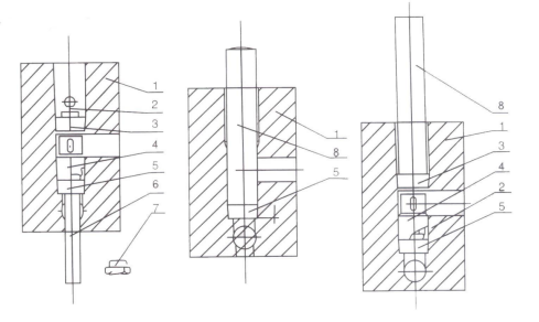 1.泵體 2.椎閥芯 3.上椎閥座 4.限位套 5.下椎閥座 6.敲棒 7.螺塞 8.敲棒(附件3)