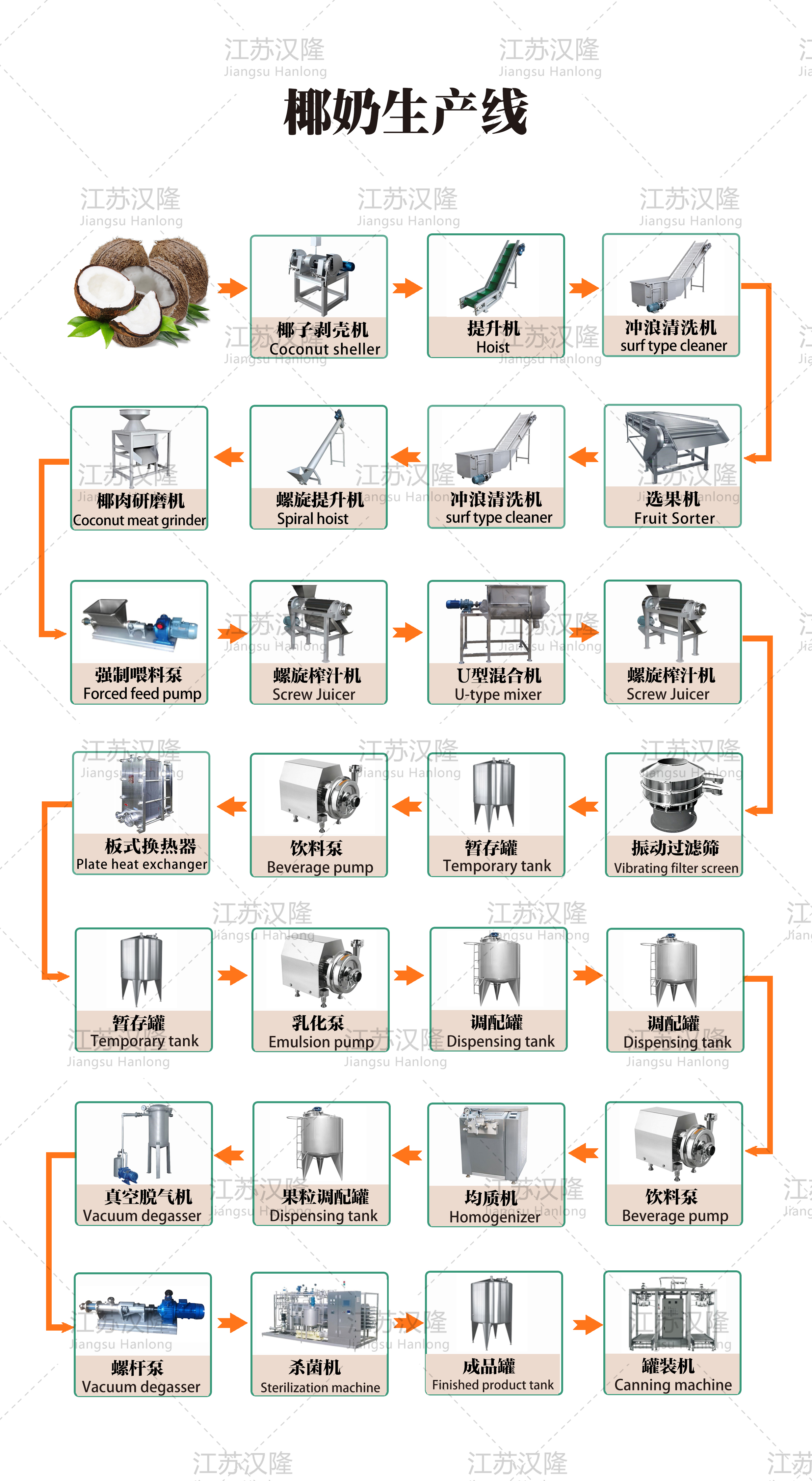 椰子破殼—椰子取肉—椰肉切碎機(jī)—膠體磨研磨—乳化均質(zhì)—調(diào)配—超高溫殺菌—灌裝—二次滅菌—風(fēng)干—套標(biāo)—縮標(biāo)—噴碼—膜包裝—成品